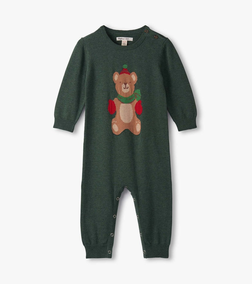 Wrap your little one in cozy charm with the Baby Boys Teddy Bear Sweater Romper in deep green. Crafted from 100% cotton yarn, this long-sleeve knit features a delightfully detailed teddy bear wearing a scarf, mittens, and a little hat. Thoughtful touches like ribbed cuffs, a crew neckline, and snap closures at the leg inseams make diaper changes a breeze, while the two-button shoulder placket ensures easy dressing.