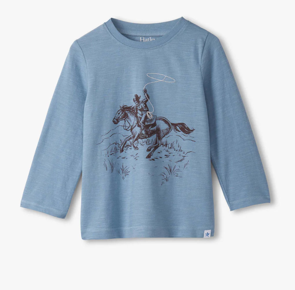 Give your little one a taste of the wild west with the Baby & Toddler Boys Ranch Graphic Lounge Set in Blue! The heathered pale blue long-sleeve crew neck tee features a charming print of a cowboy riding through the desert, accented with a playful embroidered white lasso for added texture. It pairs perfectly with soft heathered brown sweatpants, designed with an elastic waistband, functional white drawstring, cuffed ankles, and handy slash pockets.